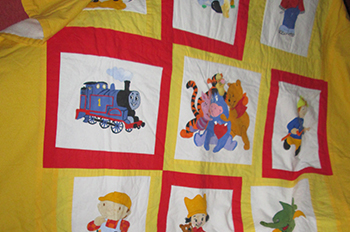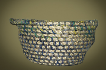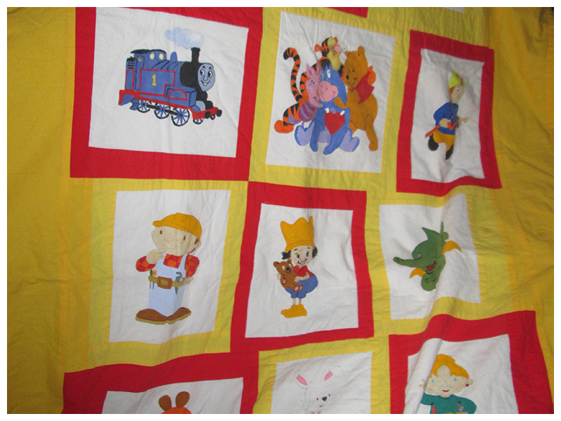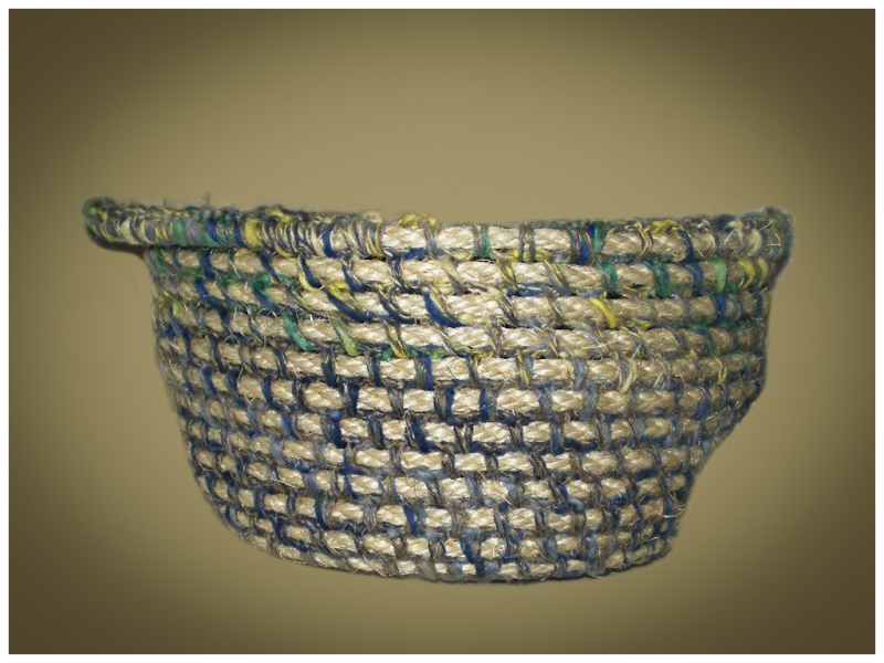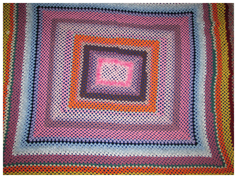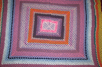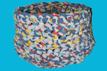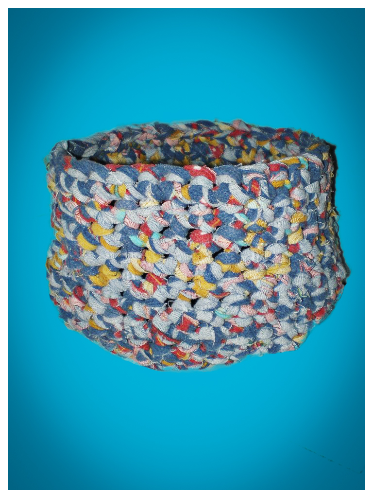 Mein Ehrgeiz zum Häkeln war geweckt. Da musste dann die Bettwäsche meiner Kinder dran glauben. In 2 cm breite Streifen geschnitten, aneinander genäht und mit einer 12er Häkelnadel in Form gebracht.
